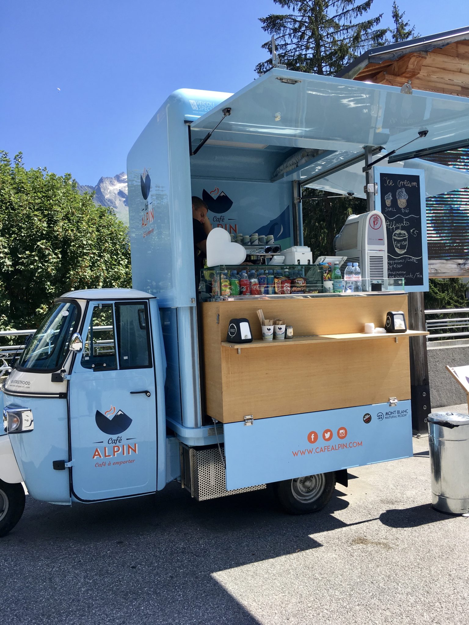 Només hi ha una taula ocupada, i hi regnen la pau i el silenci. Triem lloc, sota un parasol i amb privilegiades vistes sobre el Montblanc. Moment zen. Una noia que ve a fer-se un cafè tota sola, s’ofereix a fer-nos una foto. És el que té de bo arribar més d’hora que la majoria dels turistes.